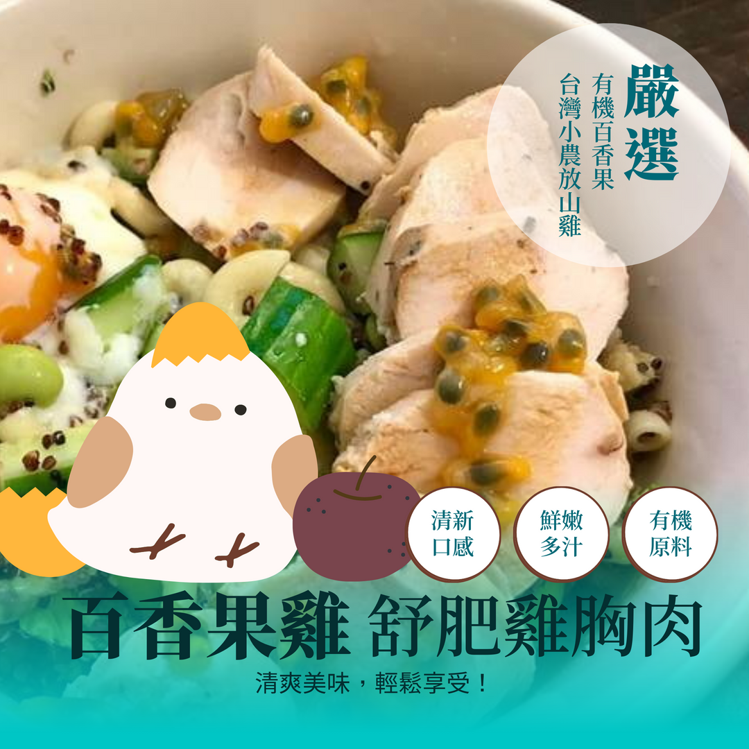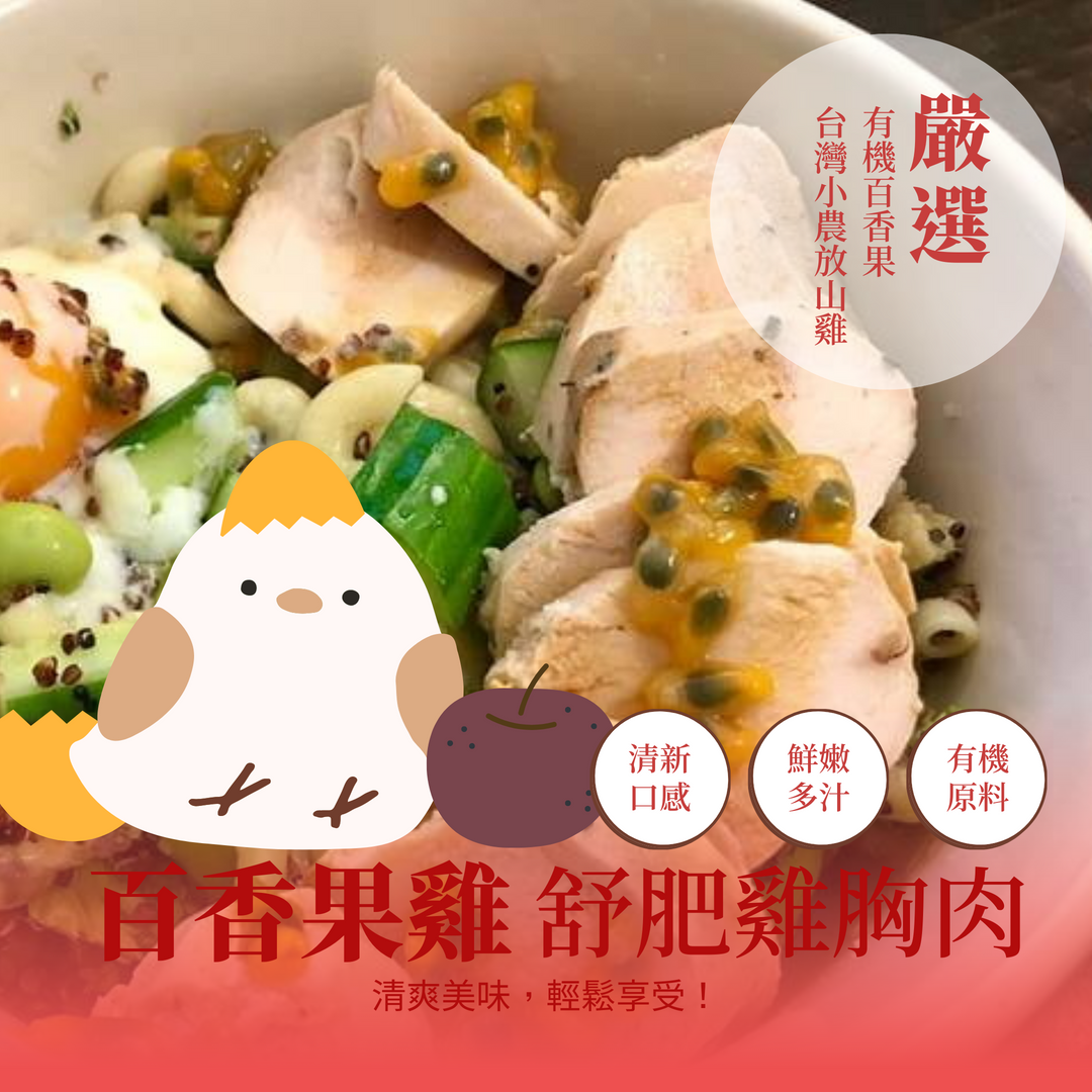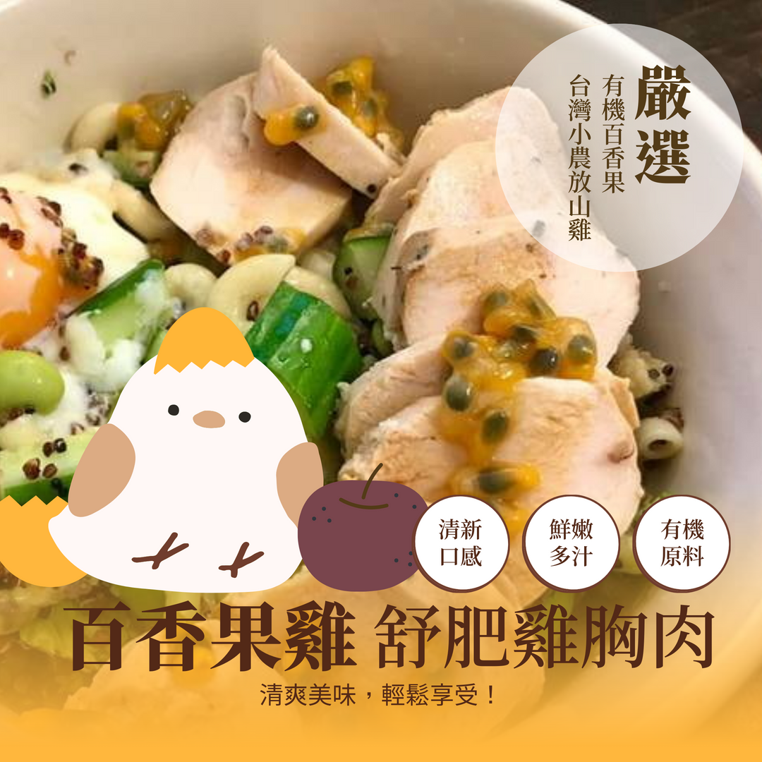 百香果雞,結合清爽的有機百香果與台灣小農放山雞,便捷又健康。打開即食,隨手包裝,讓您輕鬆解決外食口味重與料理耗時的問題。