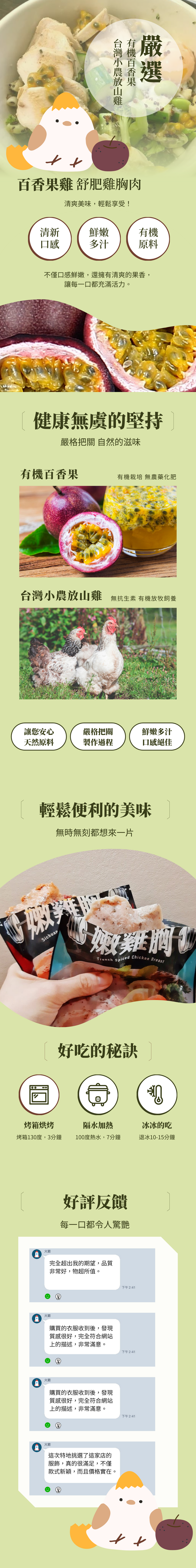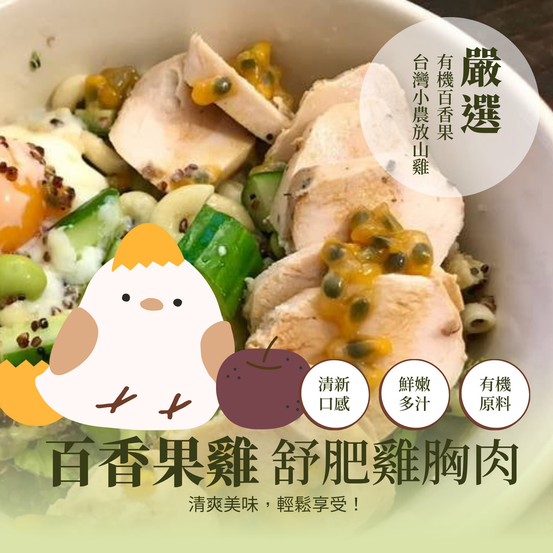 百香果雞,結合清爽的有機百香果與台灣小農放山雞,便捷又健康。打開即食,隨手包裝,讓您輕鬆解決外食口味重與料理耗時的問題。